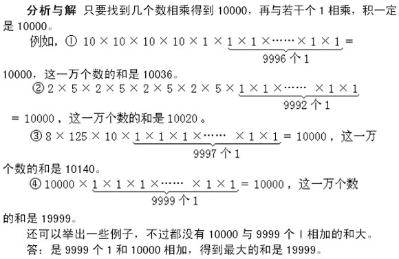 小紅的姐姐給她出了一道很有趣的題。姐姐說:“如果有一萬個自然數連乘,乘積等于10000,那么這一萬個數相加,要想得到最大的和,是哪一萬個數相加?”小紅稍加思考就答對了。同學們,你知道是哪一萬個數相加嗎?最大的和是多少?