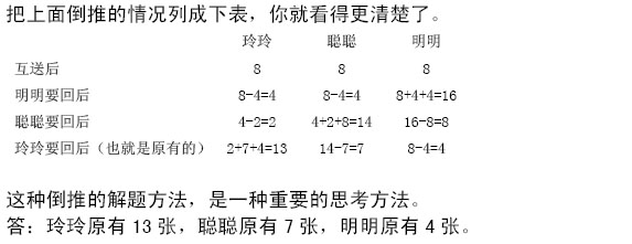 最后再想,要是玲玲不送給聰聰和明明呢?那玲玲就要從聰聰手里的14張中,要回7張來;從明明手里的8張中要回4張來,這樣,玲玲手里就有2+7+4=13張,聰聰手里還有7張,明明手里還有4張。這就是他們三人原來的張數。