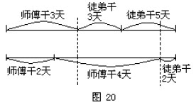 我們先用同樣長(zhǎng)的線段表示這批零件的總數(shù),再把師徒兩人干的天數(shù)按一定順序標(biāo)出來(見下圖):